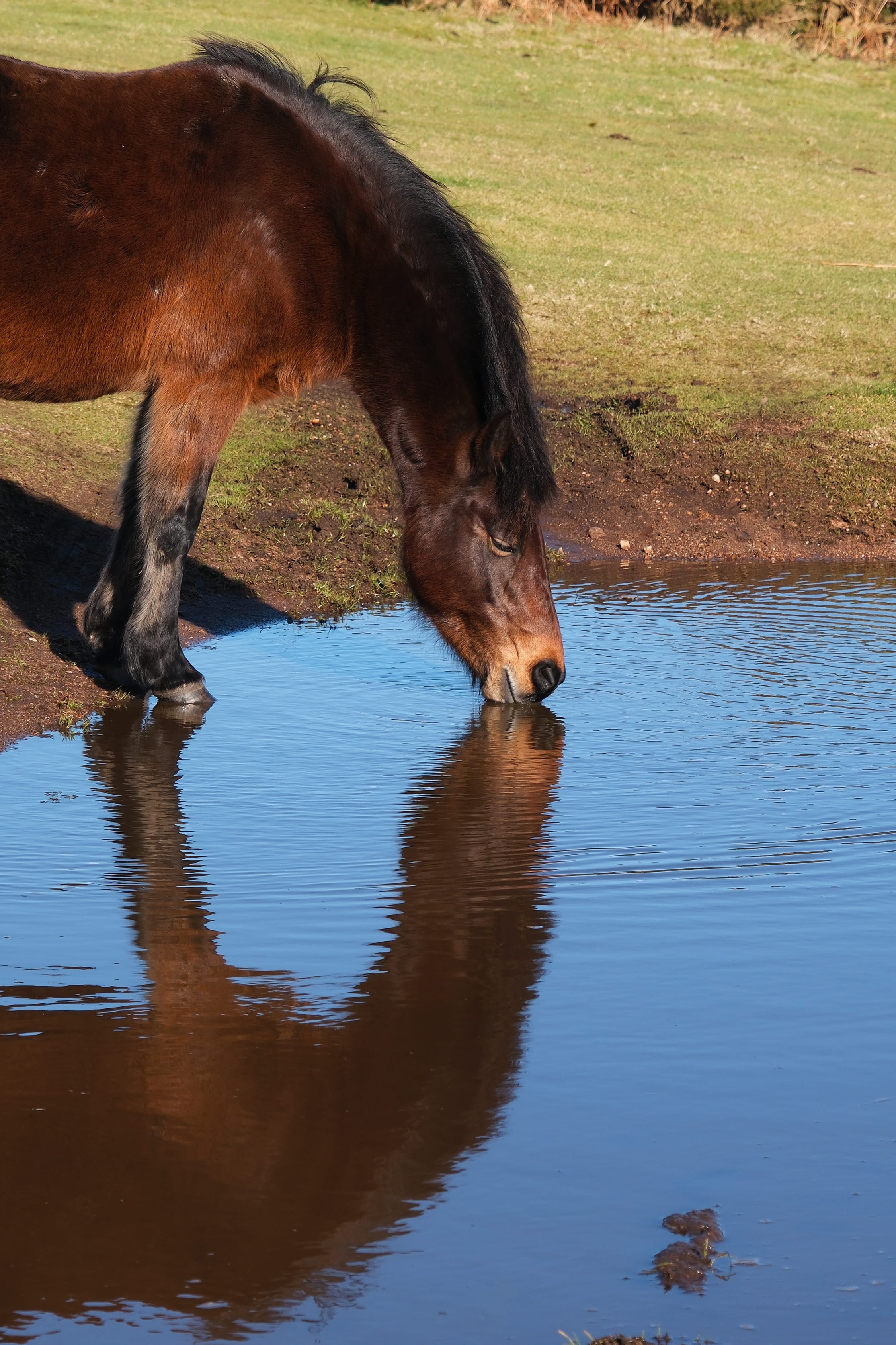 [ Wild Dartmoor pony having a peaceful drink, 6 February 2025, photograph by me. You might think a hoard of wild ponies were a greater trampling threat but no ]